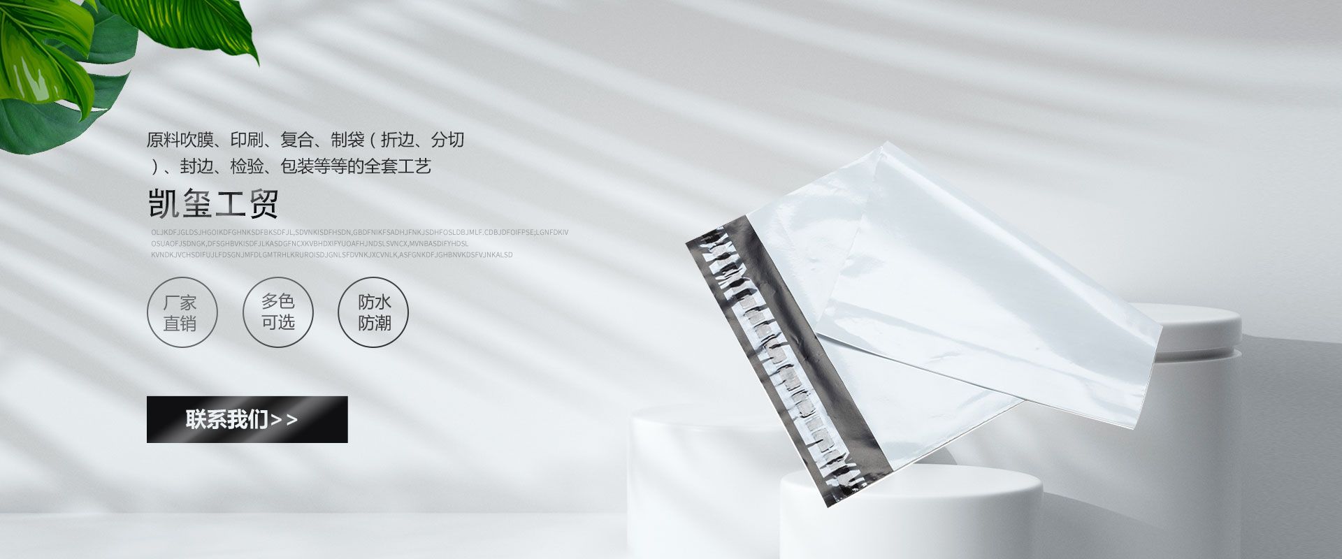 ADVANTAGE 凯玺工贸公司优势 现代化标准厂房 公司拥有现代化标准厂房近20000平方米,全面致力于塑料包装材料的开发、生产、销售和产业结构的优化调整。员工与企业同步发展。 经验丰富 诚信、实力和产品质量获得业界的认可。基于对自身数十年来生产销售的经验和广大客户的信赖,相信以我们产品质量和诚恳地服务态度能与业内外人士共创辉煌。 经营范围 公司主要生产PE快递包装袋,LDPE透明袋,PE膜,可降解购物袋,目前年产5000多吨各种包装袋,本公司产品质量稳定设备先进,拥有完整、科学的质量管理体系。 设计生产一条龙 工厂拥有流水线生产制造设备,独立完成从:原料吹膜、印刷、复合、制袋(折边、分切)、封边、检验、包装等等的全套工艺,可以根据客户的定制要求。提供一条龙服务。